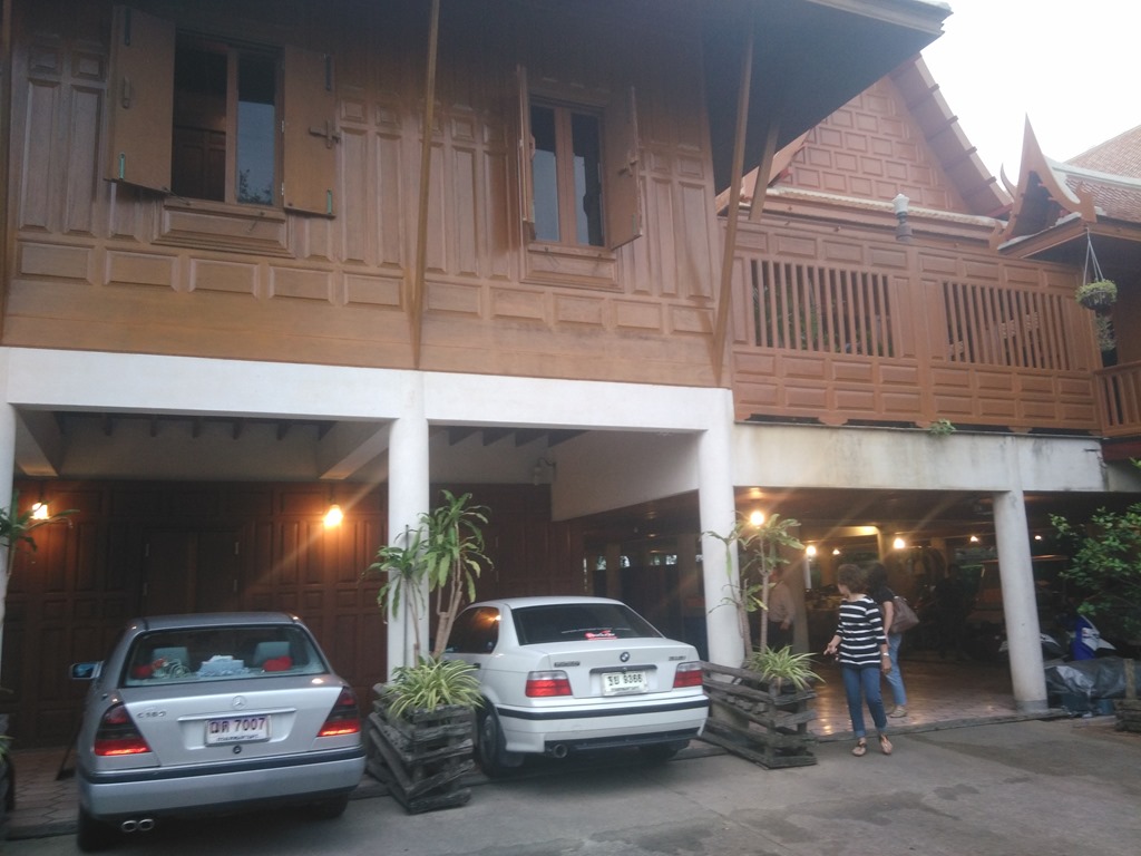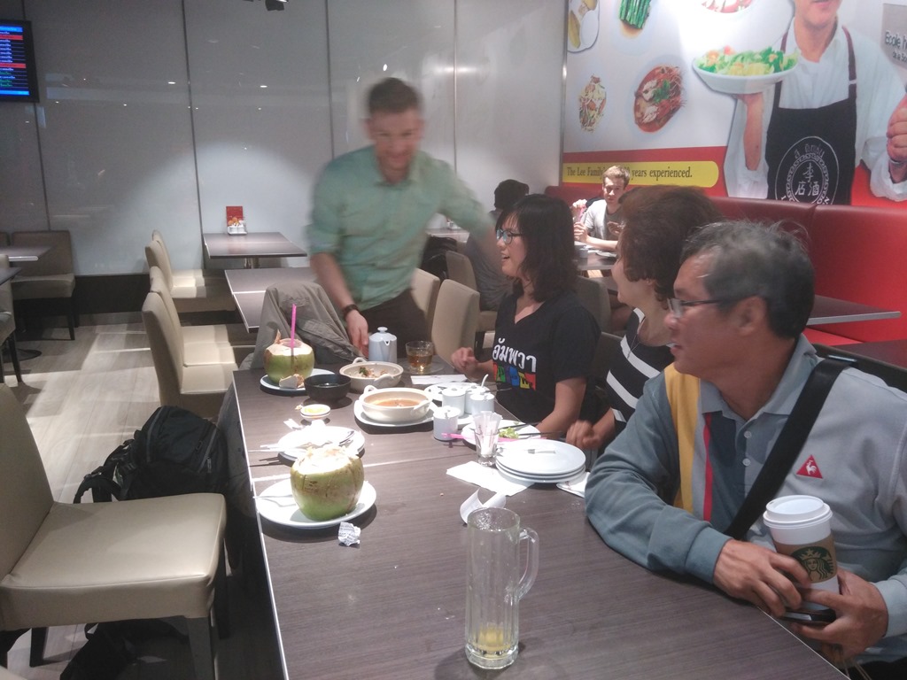 When we arrived in Bangkok after a 13 hour flight the first problems occured on the passport control. Leo and I had to fill out an arrival card, but we couldn’t read the adress on the adress-card of our family because it was written in thai. So we went to the passport control officer. He sent us back because there was a gap where the adress-field should have been. At this moment May called me. She gave me the directions where to find them at the airport. I listened carefully to get the way to the right exit. (there were three different ones) So we decided to ask another staff member at the airport to translate the thai adresss for us so that we can enter Thailand. The next time it worked and we were in Thailand, luckily our baggages arrived as well. We got them at the baggage claim and decided to exchange some money first. The course was 38,86 Baht = 1 €. First of all we changed 100€ just to make sure that we will have enough money for our journey. Following Mays instructions we found the family of her really quick. They were waiting in front of the exit B and were so happy to see us. When I saw them I was quite happy as well, because without a local phone contract I  couldn’t  inform them about our arrival in Thailand. I got to know Mays Mum. She was called Sri and Mays Dad. He was called Eahr. They both were really friendly and open-minded. On our way to the car lot, we stopped at a restaurant and had delicious thai food.We tried octopus, scampis, other sorts of fish. For dessert we had mango with sweet rice. During breakfast we drank out of a coconutshell the freshest cocout milk I’ve ever drank. Leo and me ate a lot and were quite full after the delicious breakfast.