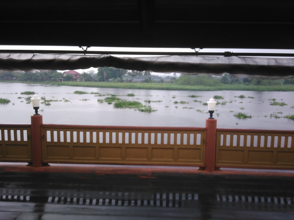 On the surface were floating waterplants like little spots on a beatle. The stream of the river was upside down and the boat traffic was moderate. Probably every hour a small boat, full of locals passed by.