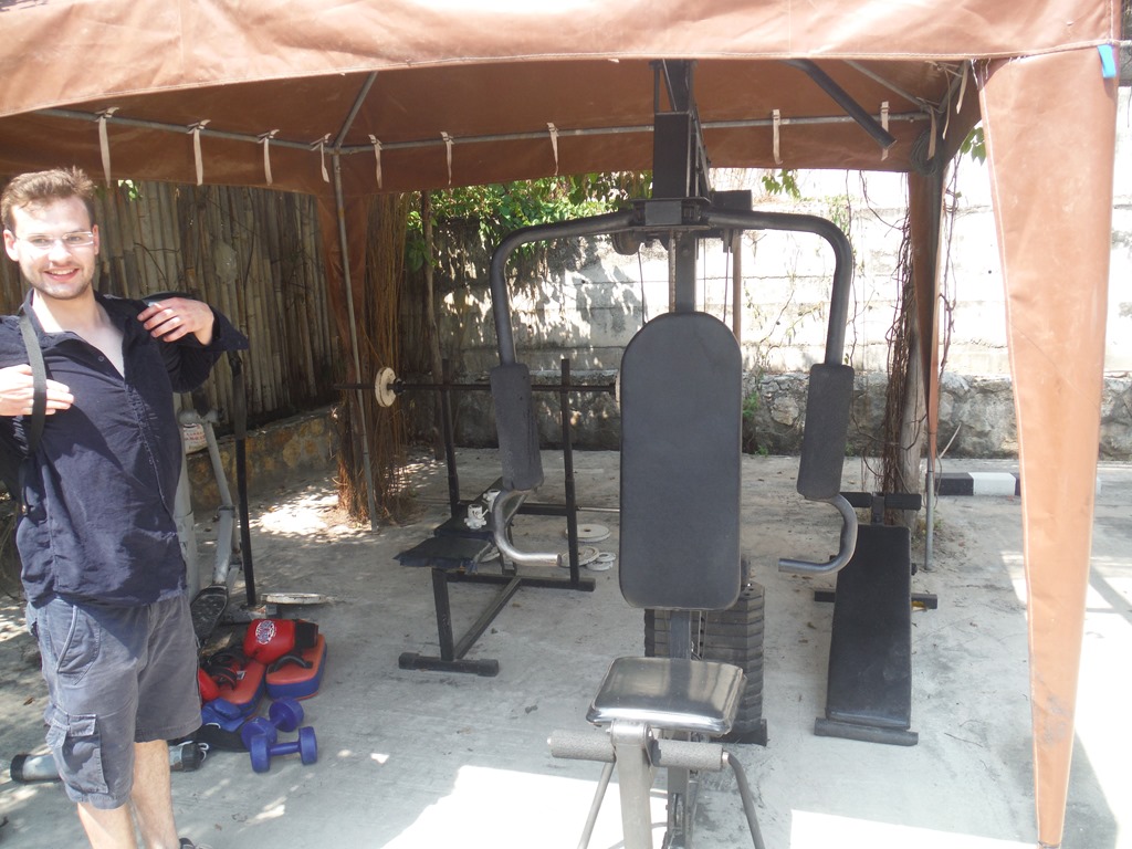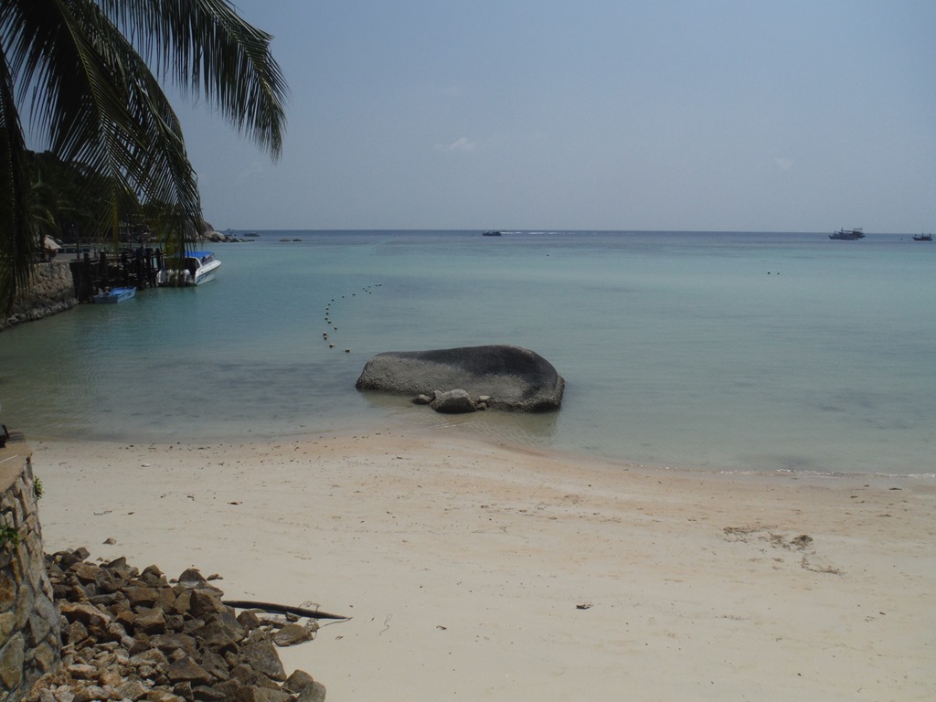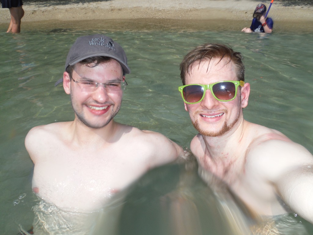 There were several machines like benchpress and pull-up bars where we could work-out. It felt good to do a good work-out after a long time without it. After our work-out session we continued to the next beach, it was approximately 5 km away. On the way to this beach we drove on roads full of sand through little villages. In Ko Taoh everybody drives a scooter, we saw even three persons on one scooter. Generally the scooters have 125 cubic and  a maximum speed between 80-120 km/h. The roads down to the beaches in Koh Tao were very steep and rocky. It was really helpful that the scooter had a lot of horsepower.  When we arrived at Freedom beach we first of all went into the water.