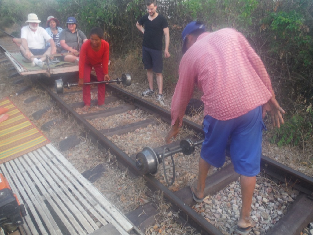 They used it in the former years to transport goods from village to village. Nowadays it became a tourist attraction. The ride on the bamboo train is quite adventurous because when you sit/lie on it you ink that the train is leaving the tracks for some seconds. The train tracks are not very straight, so sometimes the train jumps with 40 km/h from one train track to the other. Probably not made for people with high fear factors. One thing which is important to mention is that the train track is just one-way, so when there is another nurrie returning from the village. The driver has to lift the bamboo train of the tracks and wait on the side till the other bamboo train passed by.