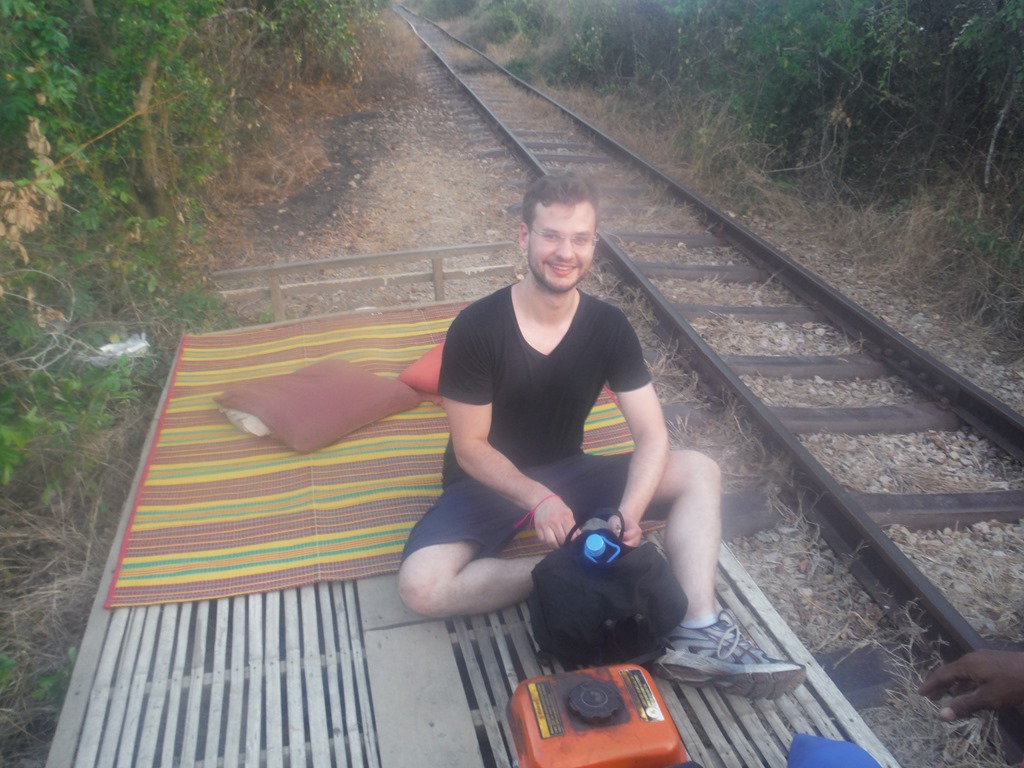 First of all he gave us a ride to  the famous bamboo train (also called nurries), which is located 5 – 10 km from the bus stop in Battambang. The experience of riding on the bamboo train was extremely awesome. The train is build out of two roulers on the train tracks and on top of this roulers they put a mat made out of bamboo sticks.