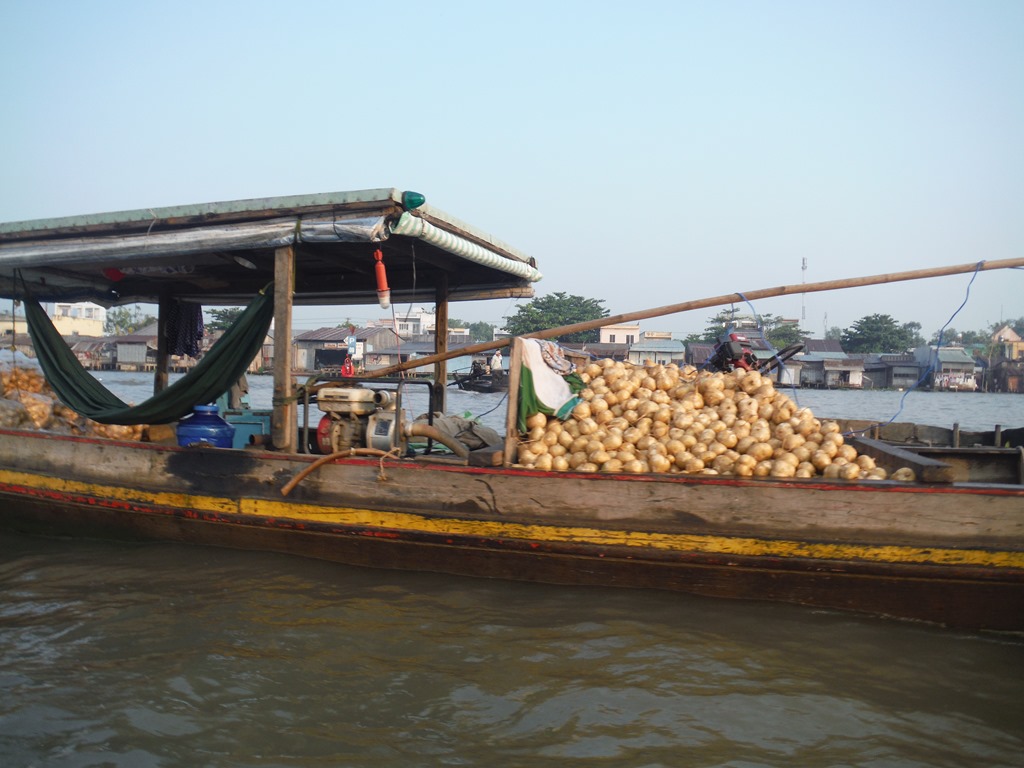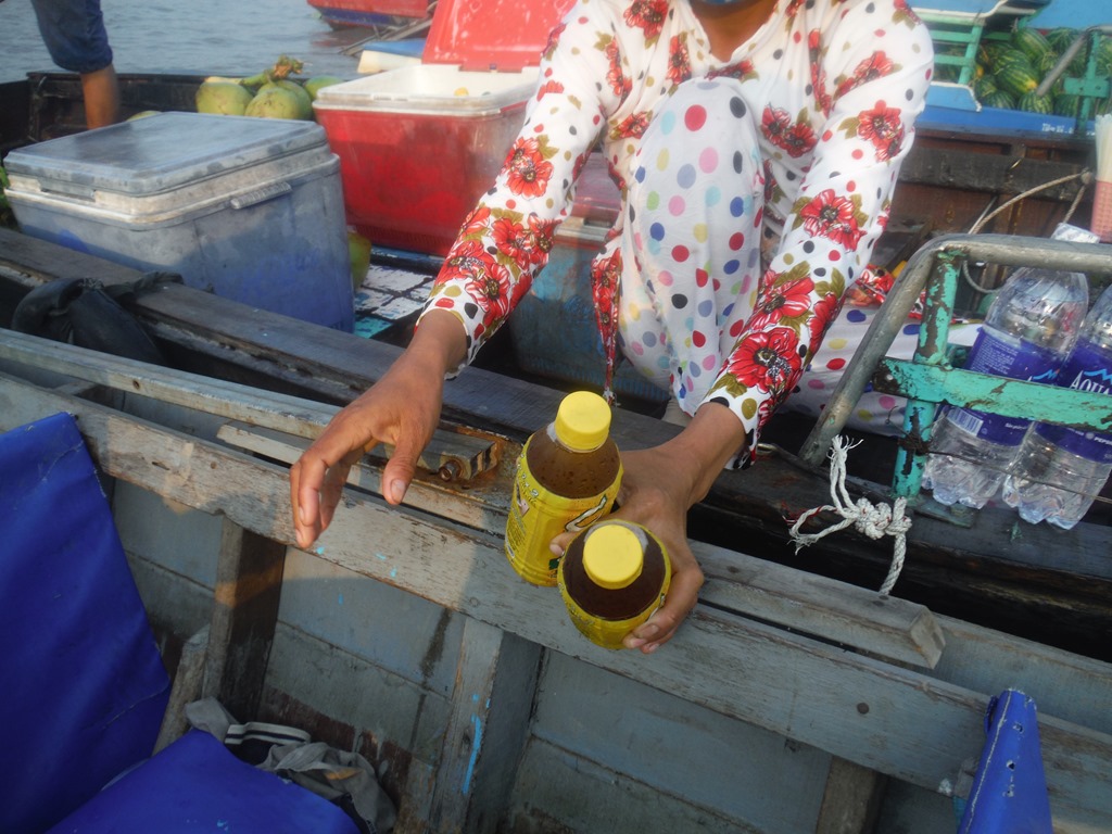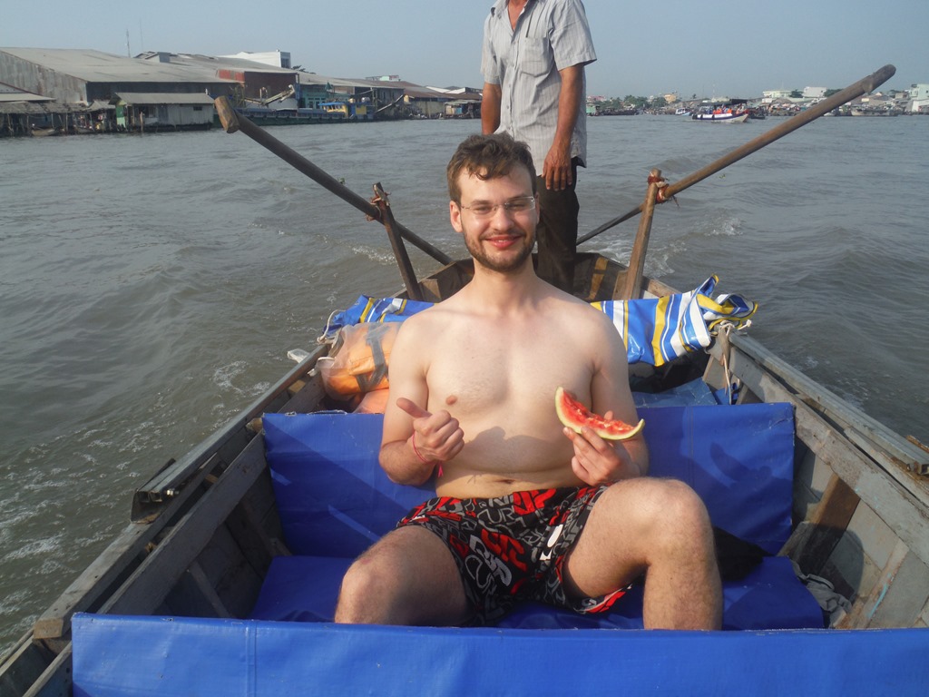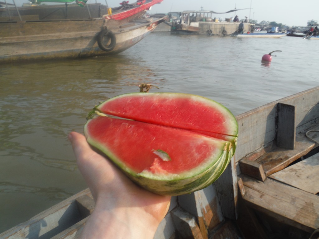 Their boats were packed with fruits, vegetables, clothes, food and different materials. It looked like a huge warehouse on the water. We bought some fresh watermelon. At the next boat we bought some ice tea. It was amazing to sit half-naked in the sun eat watermelon and drink Ice-Tea while driving on the river with an ancient long boat. DSCF8195DSCF8214