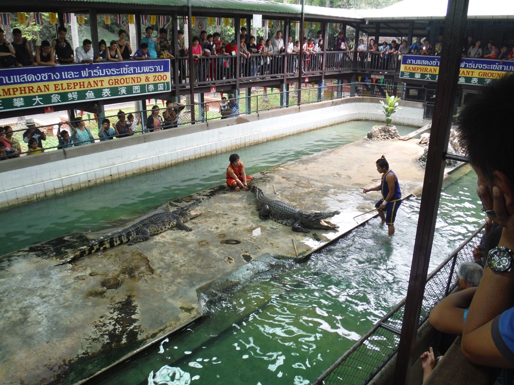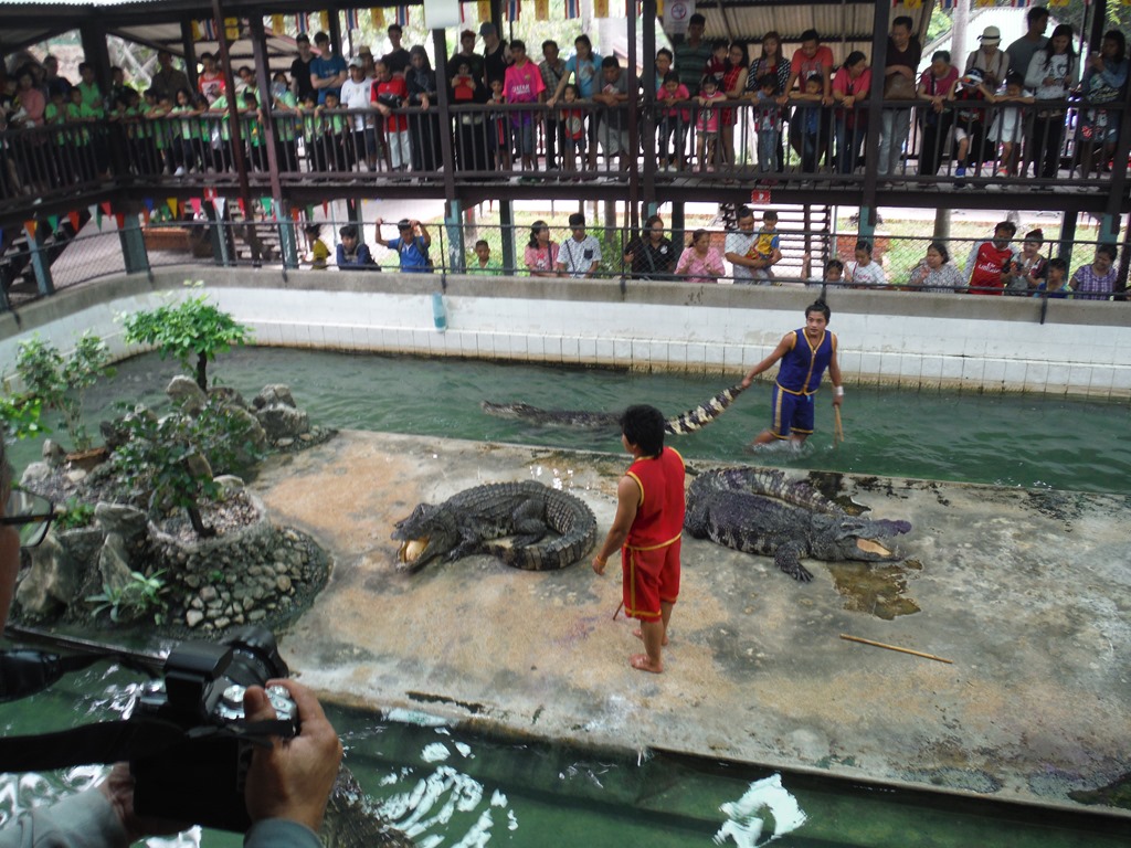After the ride we had lunch in the restaurant of the zoo. The lunch was okay. There was a buffet with different kinds of thai food, but the overall quality wasn’t satisfying us that much. We ate and got the information that tonight we will go out for dinner to a restaurant with the rest of the family. We were quite happy to hear that. When we finished lunch we went to the crocodile show. The show started and two young (approximately 16 year old) boys entered the arena of the crocodiles. They looked afraid and not professional at all.
